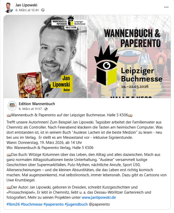 Wannenbuch & Paperento auf der Leipziger Buchmesse. Halle 5 K506 – Trefft unsere AutorInnen! Zum Beispiel Jan Lipowski. Tagsüber arbeitet er als Controller. Nach Feierabend klackern die Tasten am heimischen Computer. Was dort entstanden ist, ist in seinem Buch „Auslese: Lachen ist die beste Medizin“ zu lesen – neu bei uns im Verlag. Er stellt es am Messestand vor – inklusive Signierstunde. Wann: Donnerstag, 19. März 2026, ab 14 Uhr, Wo: Wannenbuch & Paperento Verlag, Halle 5 K506