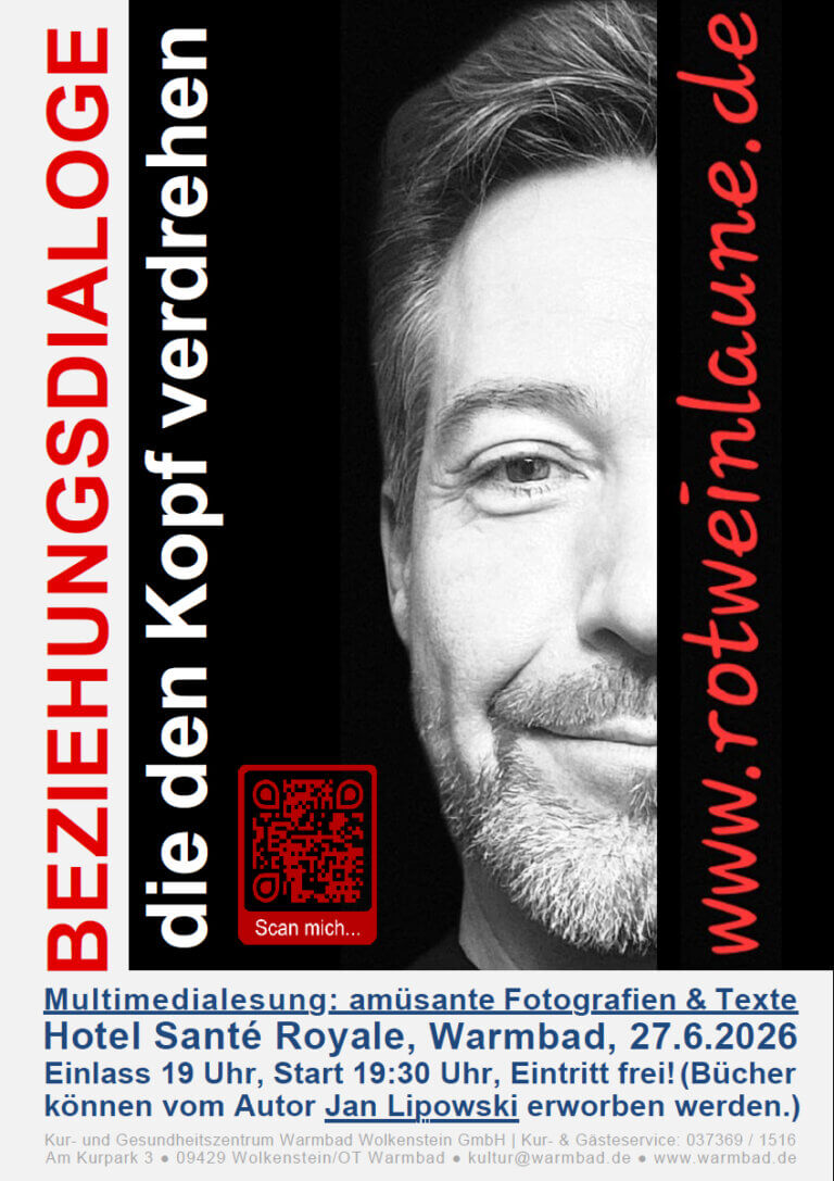 Lesung zum Valentinstag von und mit Jan Lipowski: »Beziehungsdialoge, die den Kopf verdrehen!« Hier wird es hochamüsant, tempo- und pointenreich … Texte für Singles und für Paare, die es bleiben wollen. Dialoge vor, in und am Ende einer Ehe, in Entfernungsbeziehungen, mit Küchengeräten, mit Nachbarn, Fachärzten und mit der Jugend, beim Sport, bei Wein und (im) Tee … und was passiert, wenn Männer (!) älter werden!? Dazu neue Texte aus dem druckfrischen Best of-Band: »Auslese!«